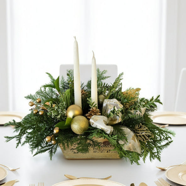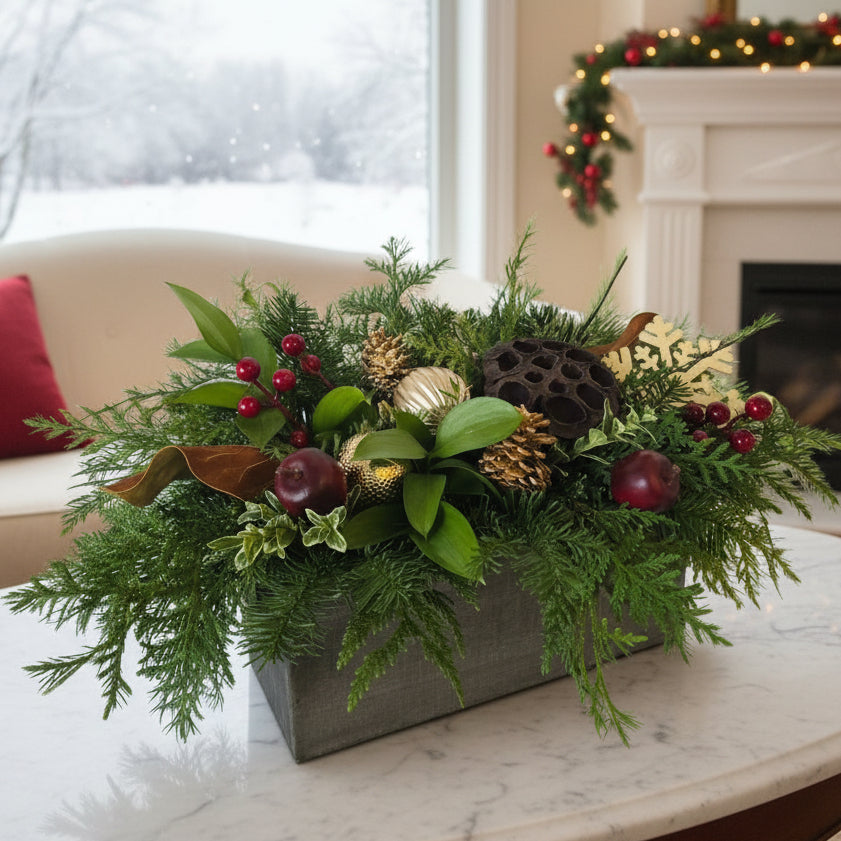 These all greenery arrangements are perfect for any office or home. Each arrangement is filled with long lasting fragrant winter greens and an array of holiday accents.