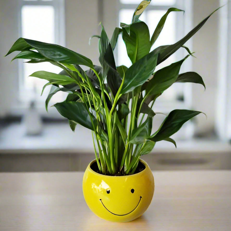 Super easy to care for Peace lily plant arrives in fun Smile face ceramic container.