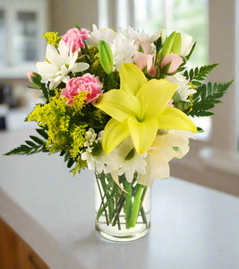 Lovely lily, roses, carnation and daisy arranged in classic clear vase and finished with pretty bow. Note if lily is not available, large showy cremons will be used.