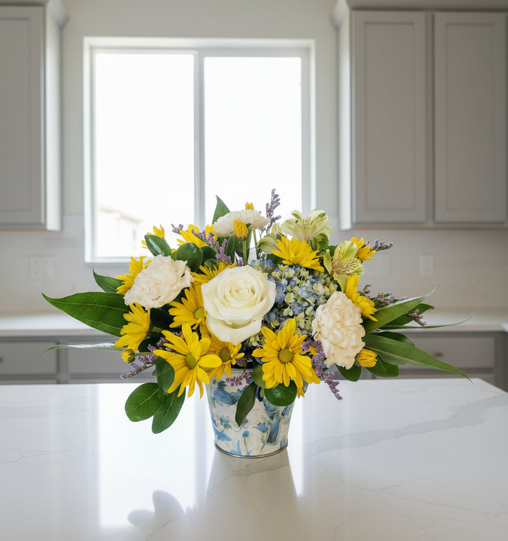 Sometimes you need something sweet and pretty and this is the perfect arrangement for that! Cheery daisy, white ross arranged in lovely blue and white tin.