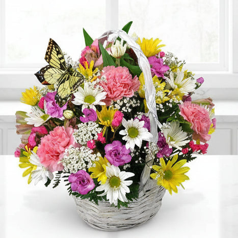As bright as the morning sun! This popular basket arrives with lily, daisy and carnations in bright spring blooms with pretty floating butterfly.