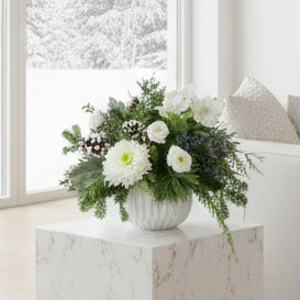 Crisp white blooms with touches of dusty silver and blue, set in beautiful ceramic vase.