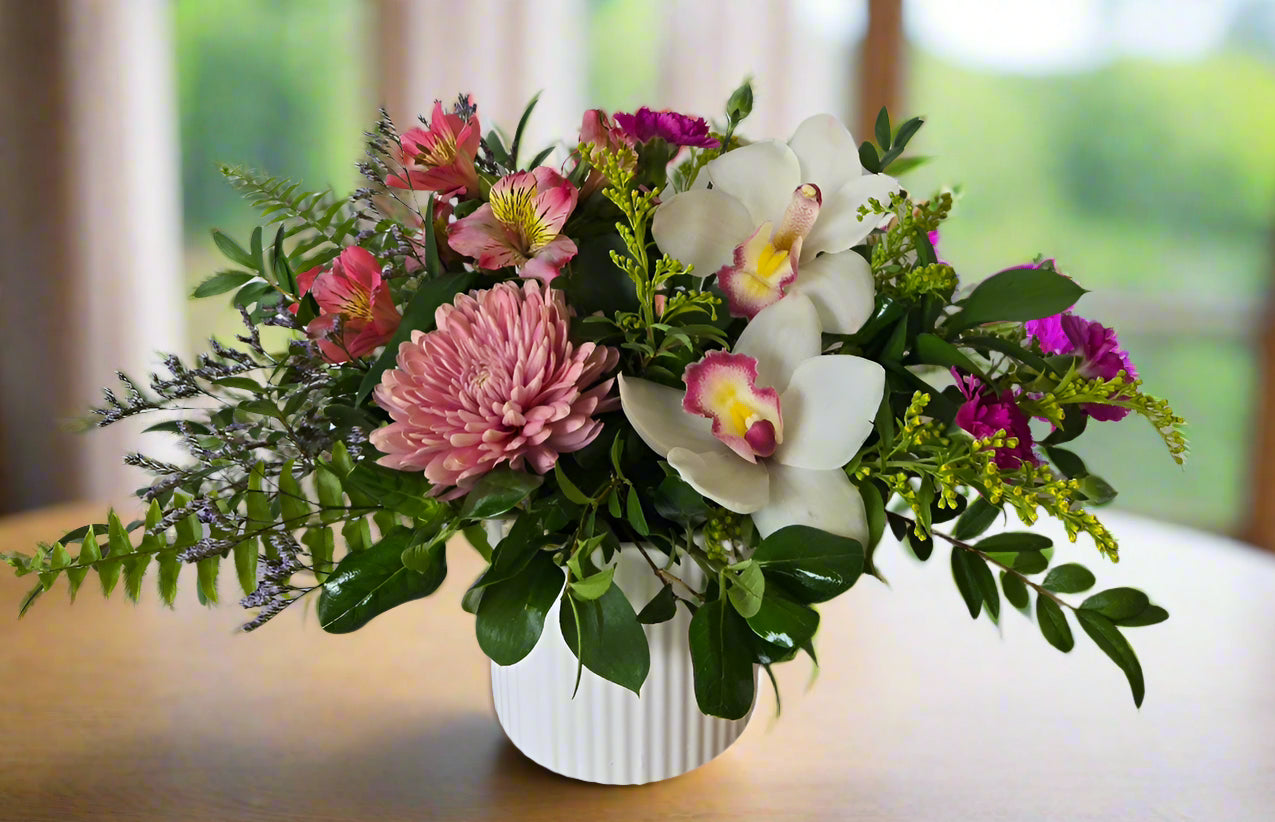 Lovely long lasting orchids arranged in ceramic container together with cremons, alstroemeria, accent blooms and delicate greens.