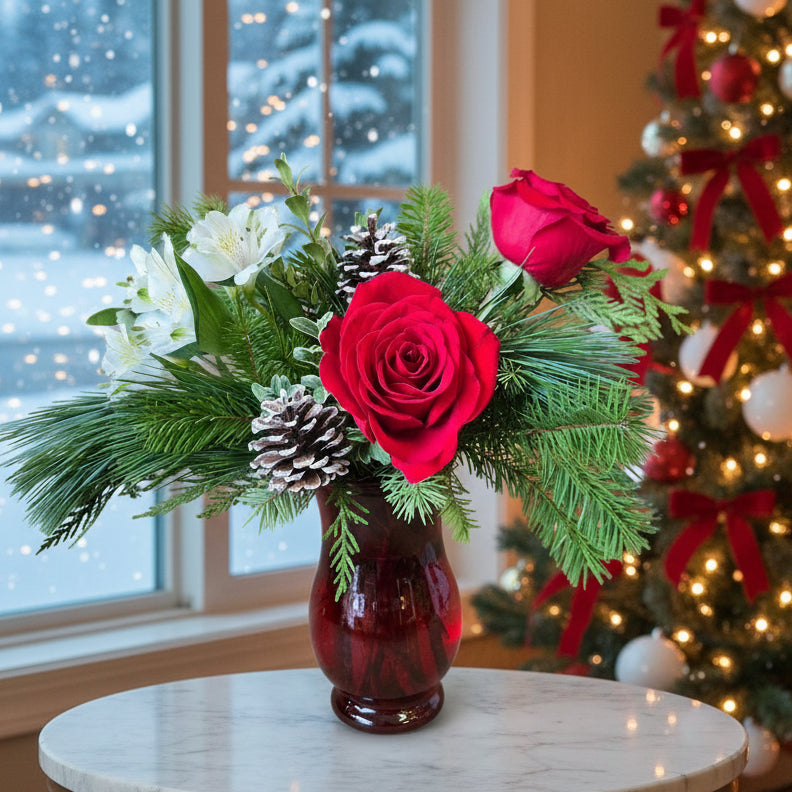 Festive red vase filled with fresh holiday greens, winter white alstroemeria and crimson roses finished with pined cones.