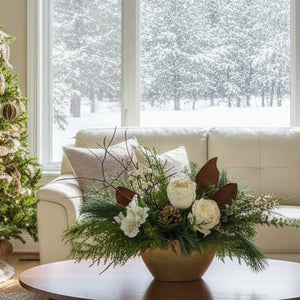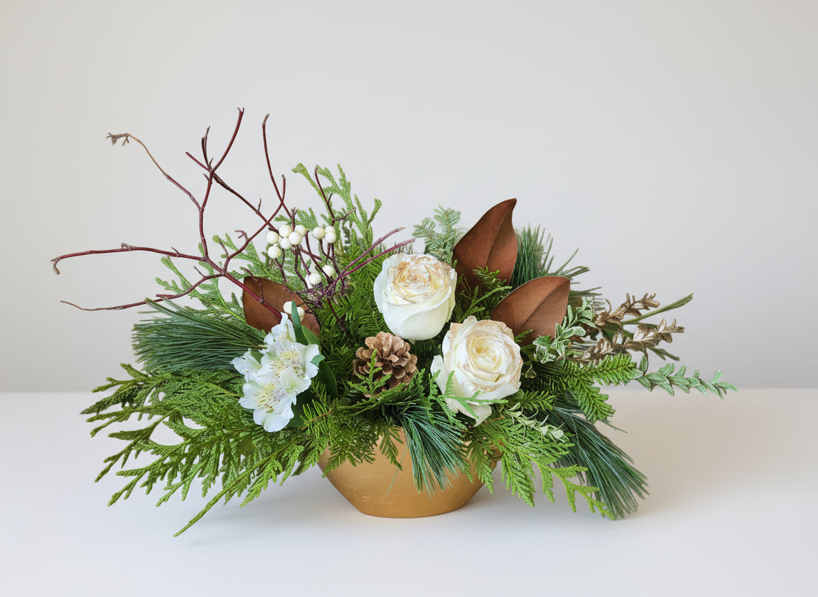 Beautiful gold container filled with winter greens, premium white roses, natural twigs, rich magnolia and golden accents.