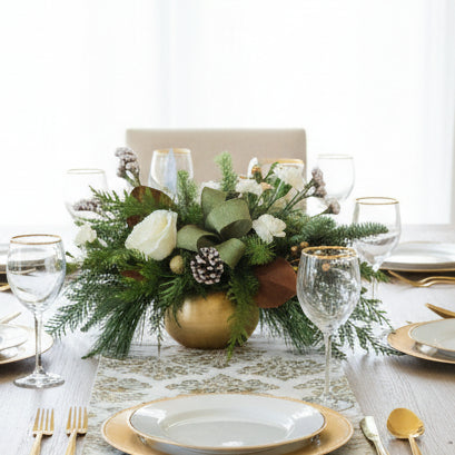 Lush fragrant winter greens, rich magnolia leaves, full creme roses and crisp white mini carnations artfully arranged in gold ceramic bowl.