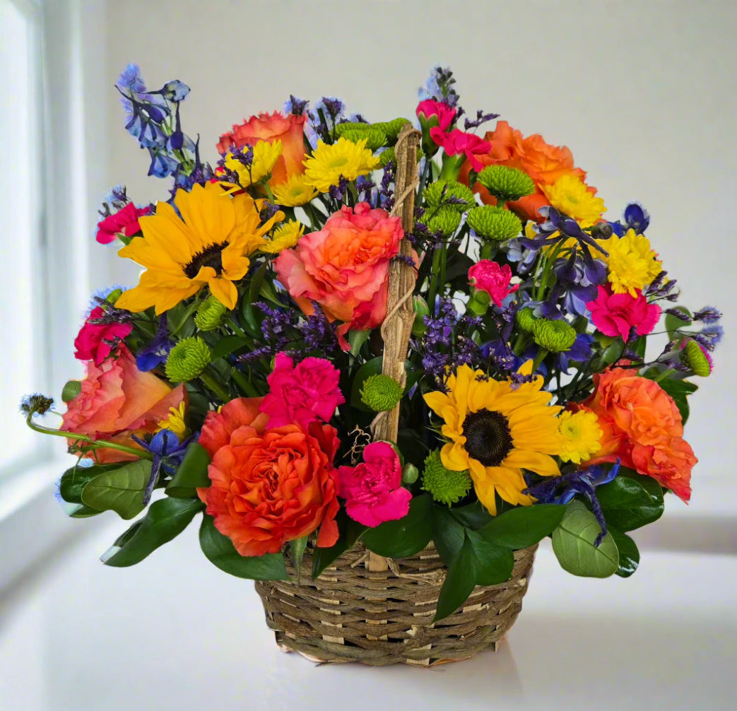 This beautifully bright basket is filled with fresh roses, mums, poms and more in bright and bold citrus shades.