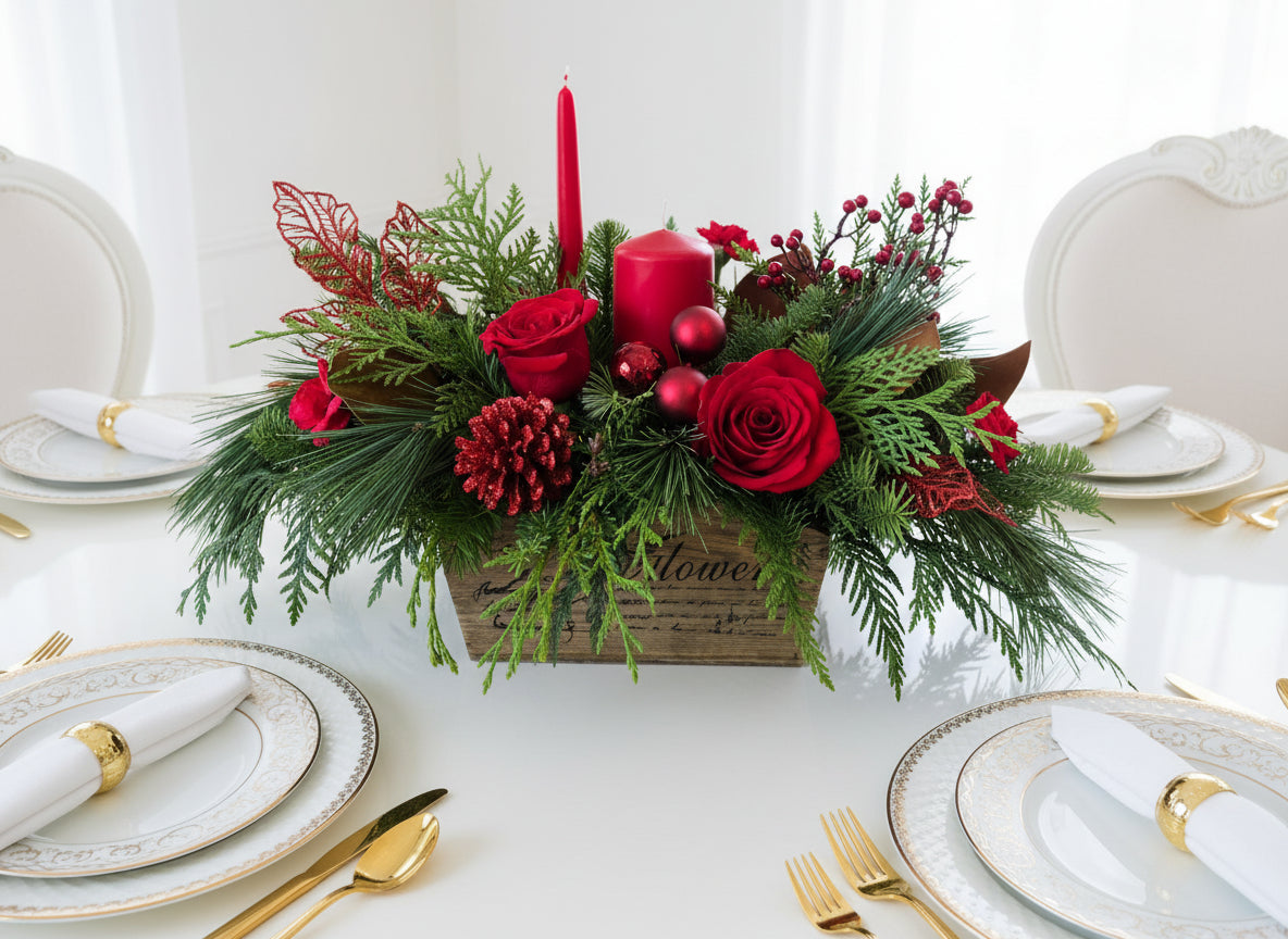 Long lasting and large showy piece arrives in wood box filled with winter greens and candles as shown. Lush red roses, alstromeria and mini carns add the perfect elegant touches!