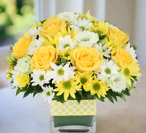 Send a little sunshine with this sweet and simple arrangement featuring yellow roses and cheerful daisies!